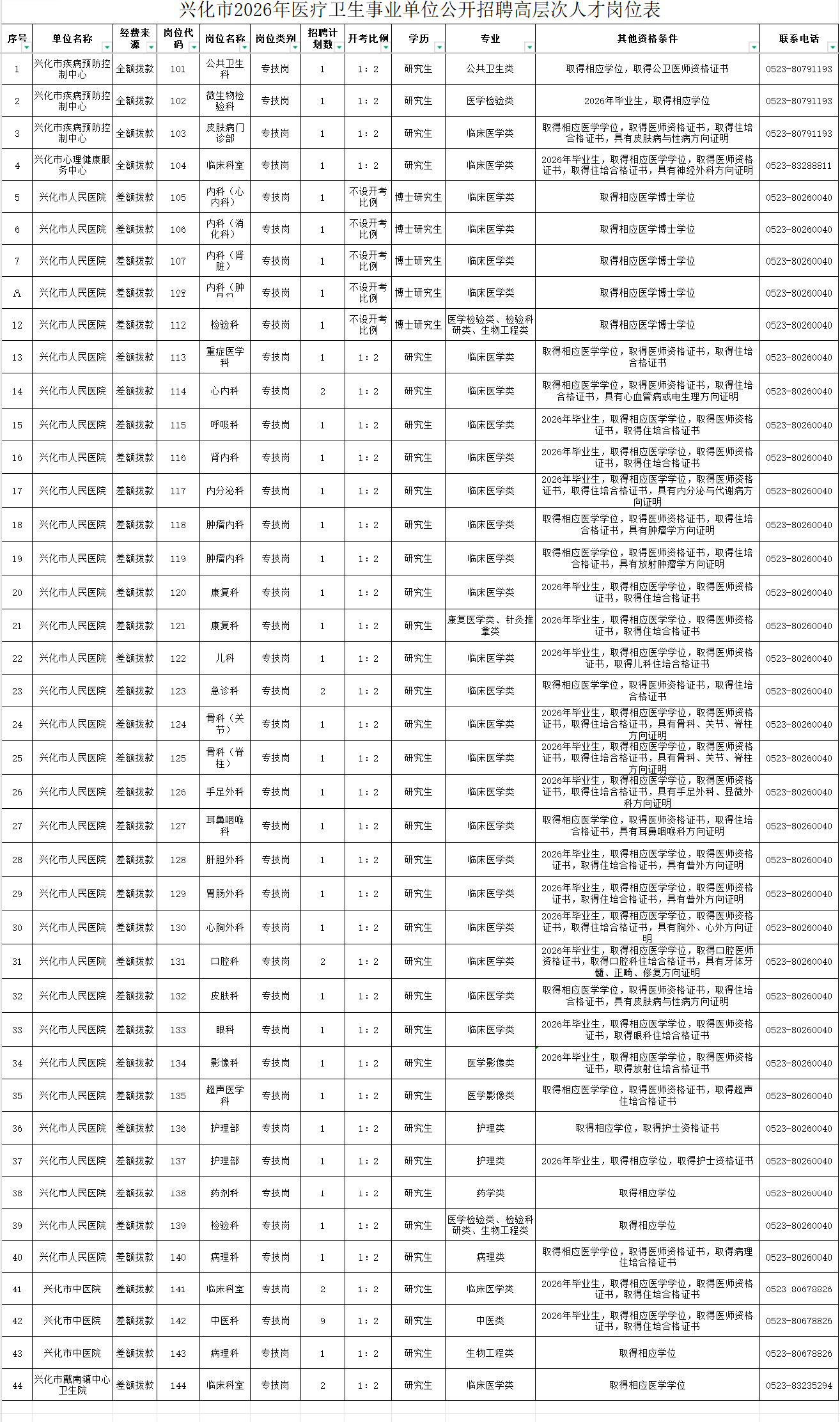 附件1:兴化市2026年医疗卫生事业单位公开招聘高层次人才岗位表