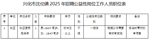 附件1:兴化市沈伦镇2025年招聘公益性岗位工作人员职位表