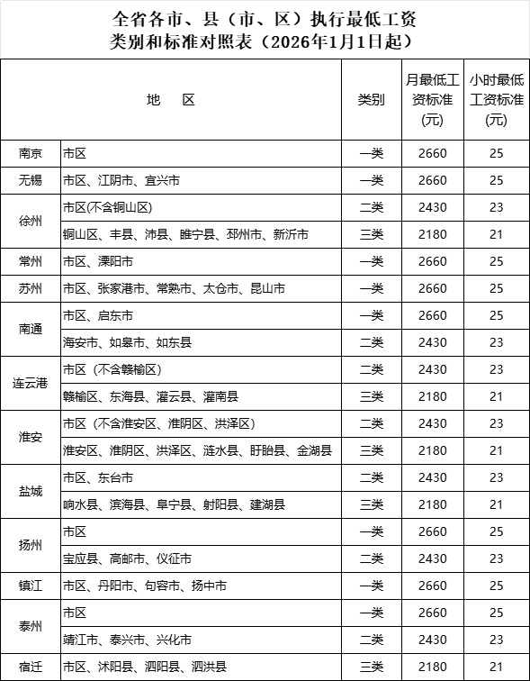 根据《最低工资规定》(原劳动保障部令第21号)和《江苏省工资支付条例》规定,经省人民政府同意,从2026年1月1日起调整全省最低工资标准。现就有关事项通知如下: